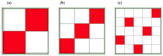 Figure 1 depicts the samples’ rapport, and Figure 2 displays a three-dimensional representation of these fabrics. Figure 1a and Figure 2a show the taffeta, the smallest course weave pattern possible, where it can be observed that the number of interlacing points amounts to 4. In the images corresponding to 2 e 1 twill and 3 e 2 satin, the course of the weave pattern increases, and so does the number of interlacing points; however, the interlacing coefficient (IC) decreases.