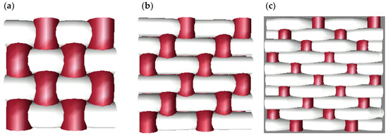 Cross-sectional 3D simulation view of fabrics used: (a) taffeta 1 e 1; (b) twill 2 e 1; (c) satin 3 e 2.