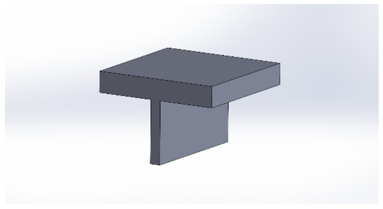The part to be placed in the lower jaw was designed consisting of a base for the fabric and a gripping area for the jaw and the fabric. On this piece will be placed the piece described in Figure 4, together with the analyzed textile. Specifically, the design was made following the measurements of the dynamometer jaw and consisted of a T-shaped piece. This piece allowed the fabric to be held in the lower jaw. Moreover, the dimensions of the base coincided with the square printed on the fabric in order to center both 3D pieces in the vertical axis of the dynamometer. Specifically, the part had the shape shown in the attached image extracted from the design made using SolidWorks. Variations were also made of this part until the optimal design for this application was achieved.