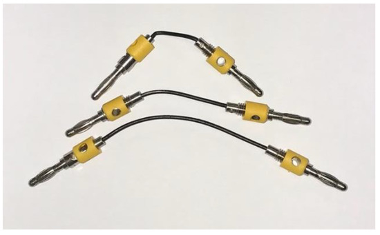 Once the fabric with the best adhesion results was determined, the electrical resistivity of the conductive PLA with graphene (BlackMagic3D) was measured. It was determined both raw with the filament taken directly from the spool and annealed in an FED-115 oven (Binde GmbH, Millvilem, NJ, USA) at 220 °C for 10 s. The resistivity measurement was performed using a 4200A-SCS Semiconductor Characterization System (Keythley, Solon, OH, USA) from which the resistance value of 3 filament specimens of 20, 40, and 80 mm with a diameter of 1.78 mm was obtained (Figure 5). The resistivity was obtained from the relationship between the resistivity and resistance, length, and area of the filament.