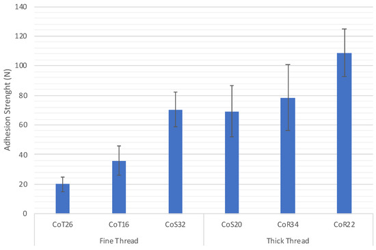 These same results detailed in Table 4 are represented in Figure 8, where the adhesion obtained is compared according to the weave of the fabric used and the thickness of the yarn. A clear difference is observed between fabrics whose wefts are of different thicknesses, with the same behavior regardless of the weave present in the fabric. The higher the yarn count (or thickness), the greater the adhesion of the printed conductive polymer on the textile substrate. Similarly, there is a significant influence between the weave used and the adhesion achieved. A better adhesion in the satin fabric and a lower adhesion in the taffeta fabric were achieved.