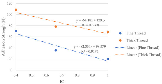 Figure 9 shows a clear relationship between the bonding coefficient and the adhesion obtained between the polymer and the surface of the fabric, showing that the higher the bonding coefficient, the lower the adhesion. This decreasing tendency of adhesion is observed in both cases, when using thick or thin yarn, but as it is also observed in both Figure 8 and Figure 9, the adhesion of both materials is greater when using thicker yarn as weft. There is a difference of between 30 and 40 N if the results are compared between the thick and thin yarn of the three fabrics with different weaves.