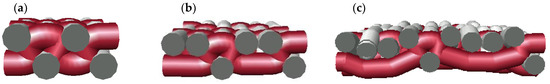 To understand the difference between the weaves used, a simulation of the three fabric structures studied is shown in Figure 2, a 3D representation of the surface of the fabric, and in Figure 10, a representation of each of these structures in cross section, where the interweaving of the warp with the weft and the evolution of a thread from the face of the fabric to the back can be clearly observed.
