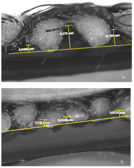 Figure 11 shows the magnified images of the cross section of the Cos32 and Cos20 fabrics printed using 3D technology. In Figure 11a, where a thicker weft yarn is used, the interaction between yarns and the printed polymer can be clearly observed. Focusing on the depth of penetration of the polymer in the interfilament gaps, it is observed that at those points of yarn inflection, the penetration of the conductive polymer is lower, between 0.090 and 0.180 nm. On the other hand, in the interfilament spaces where there is no warp inflection point and two weft yarns are found together, there is a greater depth of penetration of the printed polymer, with a depth of 0.270 nm. If we compare the penetration behavior of the conductive PLA in the fabric with a thread of lesser thickness in the weft direction (Figure 11b), the printed polymer is not in contact with the surface of the thread, with a space between the polymer and the surface of the fabric. It should be noted that, in the same way as in the fabric of greater yarn thickness, at the points where the inflection point is found, there is less depth, with a penetration of 0.02 nm, while in the spaces where the warp yarn inflection is not found, there is a depth of 0.04 nm. It is worth highlighting the difference found in the depth of penetration of the polymer in the enclaves formed between the weft yarns, which was 0.270 nm in the weft fabrics of thick yarn and 0.04 nm in the weft fabrics of finer yarn.