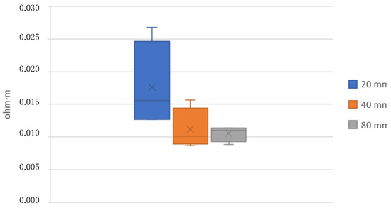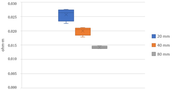 Table 6 and Figure 12 and Figure 13 show the results of the resistivity measured on 20, 40, and 80 mm standard filaments in both raw and annealed conditions. It is observed that the measurements on the 20 mm specimens are slightly different from the 40 and 80 mm specimens. The resistivity before extrusion is 0.0136 Ω-m, decreasing after extrusion to 0.0105 Ω-m for the 80 mm filaments. The manufacturer supplies a resistivity of 0.0060 Ω-m, without specifying whether this value corresponds to its raw or already extruded state.