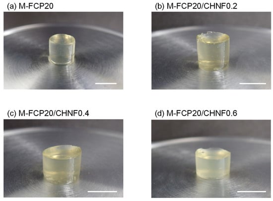 The composite hydrogels of M-FCP with CHNF were prepared by photocrosslinking with a radical photoinitiator. First, 0.96% CHNF dispersion was added to water and sonicated for 30 s using a Branson Sonifier 250 ultrasonic homogenizer (Emerson Electric Co., St. Louis, MO, USA). M-FCP and Irgacure 2959 were dissolved in the CHNF dispersion. The final concentration of M-FCP in the solution was varied as 15 or 20 wt%, while that of CHNF was varied as 0.2, 0.4, or 0.6 wt% (Table 1). The hydrogel samples were named following this pattern: M-FCP15/CHNF0.2 for a composite hydrogel fabricated from an original solution containing 15 wt% M-FCP and 0.2 wt% CHNF. The final concentration of Irgacure 2959 was 0.05 wt%. To prepare sample specimens for the compression test, the solution was poured into a small Teflon sample vessel with an inner diameter of 10 mm and a height of 20 mm, then degassed for 30 min under reduced pressure before UV irradiation. To prepare the sample specimens for the tensile test, the solution was poured into a casting mold prepared from two stacked 100 mm × 100 mm silicone plates with a thickness of 1 mm, one of which had several holes with dimensions of 5 mm × 40 mm. The solution was degassed for 10 min under reduced pressure before UV irradiation. The solution was irradiated with UV light (~60 mW/cm2) for 450 s using a SpotCure SP-7 UV lamp unit (Ushio Inc., Tokyo, Japan) equipped with a homogeneous irradiation unit; the light was passed through a glass plate to eliminate light of wavelengths less than 300 nm. The gel samples for the compression test had a cylindrical shape with a diameter of 10 mm and a thickness of 10 mm, and those for the tensile test had a width of 5 mm, a length of 40 mm, and a thickness of 1 mm.