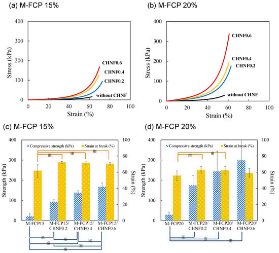 Stress–strain curves of M-FCP/CHNF composite hydrogels in the compression test ((a) M-FCP15 series and (b) M-FCP20 series). CHNF content was varied from 0 to 0.6%. The compression properties are summarized in the graphs ((c) M-FCP15 series and (d) M-FCP20 series). The columns represent mean values, and the error bars represent standard deviations (n = 5). The strength of the M-FCP/CHNF composite hydrogels was higher than that of the M-FCP hydrogels without CHNF at any CHNF content. Statistical significance was indicated by p < 0.05 (※).