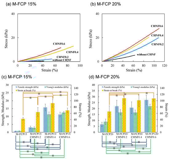 Stress–strain curves of M-FCP/CHNF composite hydrogels in the tensile test ((a) M-FCP15 series and (b) M-FCP20 series). The CHNF content was varied from 0 to 0.6%. The tensile properties are summarized in the graphs ((c) M-FCP15 series and (d) M-FCP20 series). The columns represent mean values, and the error bars represent standard deviations (n = 5). The strength of M-FCP/CHNF composite hydrogels was significantly higher than that of the M-FCP hydrogels without CHNF at any CHNF content. Statistical significance was indicated by p < 0.05 (※).