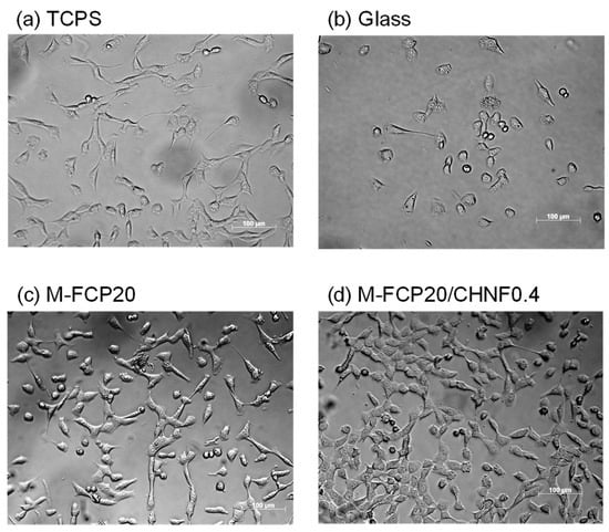 3T3 Swiss albino fibroblasts were seeded on glass coverslips covered with M-FCP hydrogel or M-FCP/CHNF hydrogel. Following incubation for a prescribed time, cell morphologies and growth were observed under a microscope. Figure 5 shows images of the results of the microscopy observations. Cells proliferated on both hydrogels, and the cell morphologies were the same as those of fibroblasts with good adhesion and proliferation reported previously [45]. We checked the circularity of cells and found that the average circularity of cells on M-FCP/CHMF (0.514 ± 0.202) was significantly lower than that of cells on glass (0.638 ± 0.163) (p < 0.05). The circularity of cells is one of the indicators of cell spreading via adhesion [46]. A lower value implies good adhesion. Figure 6 shows the results of the MTT assay, to quantitatively express the proliferation of cells [47]. According to the results of the MTT assay, we observed as much cell growth on M-FCP as on the tissue culture polystyrene. There was slightly more growth on the M-FCP/CHNF hydrogel in comparison with the growth on the M-FCP hydrogel (p < 0.05). This effect was due to the presence of CHNF, which is reported to promote the growth of vascular cells [41], keratinocytes [48], fibroblasts [48,49,50], myoblasts [51], and osteoblasts [51,52]. We consider the intrinsic reason for this effect may be attributed to the enhancement of the stiffness of the hydrogel. It is known that fibroblasts show good adhesion with extensive morphology on a harder surface [53,54,55]. As revealed by the results shown in Figure 4b, the increase in the modulus obviously follows the addition of CHNF. Furthermore, considering the small vicinal region around nanofibers from a microscopic viewpoint, the micro-regional modulus was thought to be higher than that of the bulk material that we measured in the tensile test, and cells could detect this micro-regional modulus because of their small size. Many researchers have noted the influence of nanofibers on the growth of fibroblasts [56,57,58]. According to our results, the composite materials produced only from marine resources can be applied as a biodegradable scaffold for use in regenerative medicine such as wound-dressing materials.