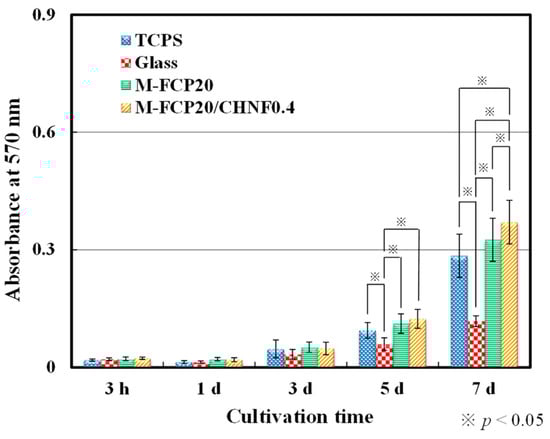 MTT assay of fibroblast growth on tissue culture polystyrene (TCPS), glass coverslips washed with acid (Glass), M-FCP20, and M-FCP20/CHNF0.4. The columns represent mean values, and the error bars represent standard deviations (n = 3). Statistical significance was indicated by p < 0.05 (※).