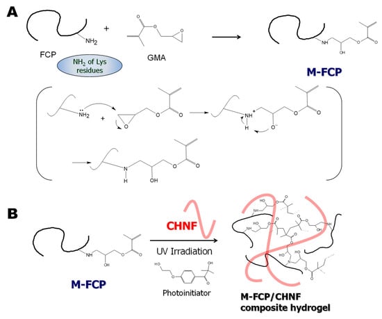 (A). Synthesis of M-FCP from FCP and GMA, and the reaction mechanism. (B). Photopolymerization of M-FCP in the presence of CHNF and a photoinitiator to obtain M-FCP/CHNF composite hydrogels.