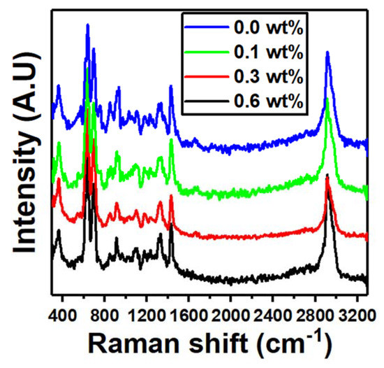 The Raman spectra of the nanocomposites at various Er2O3 concentrations are shown in Figure 4. Stretching vibrations of the C−Cl bonds induced the strong peaks at 635 and 695 cm−1. Furthermore, the stretching vibration of C−H and CH2 bonds generated the sharp peak at 2916 cm−1 [30]. The intensity of the band at 635 cm−1 of the PVC/PVP blend is increased upon doping with only 0.1 wt% of Er2O3. The intercalation of PVC/PVP/Er2O3 was proven with this level of quenching, particularly in the C−Cl region where the asymmetric stretching vibration of Er2O3 is most noticeable.