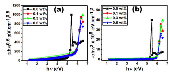 The following Tauc’s formula (Equation (6)) was used to determine the values of the optical band gap (Eopt) [40,41]: