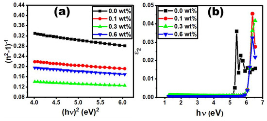 where E0 is the single-oscillator energy and Ed is the dispersion energy [50]. E0 and Ed can be calculated from Figure 8a ((n2−1) vs. by identifying the slope and interception value with the y-axis. The E0 and Ed values were found to be Er2O3 concentration dependent, as given in Table 2. The E0 value varies in the range from 4.23 eV to 4.75 eV. It increases with increasing Er2O3 content to 0.1 and 0.3 wt% and then decreases for the film doped with 0.6% Er2O3 due to the electron transition probability within allowed electronic bands [51]. The Ed value also varies in the range of 10 eV to 27.9 eV, depending on the concentration of Er2O3. Its variation trend is compatible with the values of E0 and the optical band gap. The Ed value increases rapidly for the PVC/PVP polymer films doped with 0.1 and 0.3 wt% Er2O3, which reflects the enhancement in optical transition strength between the polymer blend and Er2O3. This, on the other hand, indicates that a charge transfer between the PVC/PVP blend and Er2O3 took place [39]. The reduction in Ed value as the concentration increases to 0.6 wt% may be explained by the formation of defects in PVC/PVP chains. The dependency of E0 and Ed values on the doping concentration agrees with a previous study on PVC/SiO2 [52]. In our study, almost all optical parameters depend on the Er2O3 concentration, which can be considered as a key control for the energy of excitation in the PVC/PVP matrix composites. The static refractive index (n0) at (hv→0) can be evaluated by Equation (9) [53]: