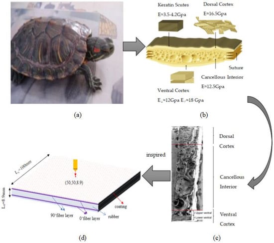 The adult red-eared slider turtle has a long oval body, a gently elevated dorsal carapace with distinct ridges, and a serrated posterior edge, and it is considered to be an invasive species. The microstructural characteristics of the red-eared slider turtle obtained from the scanning electron microscopy (SEM) results in the literature [] are shown in (b) in Figure 1. As shown in the figure, the armor is composed of a sandwich composite structure that consists of a relatively dense exterior covering the interior of a fiber foam network, a biomimetic design based on its structural features. The sandwich structure in this study is composed of PVB/ethanol solution coating, unidirectional carbon fiber layer, and foamed silicone rubber sandwich layer, taking into account the size of the tortoiseshell back armor structure and the size of the impact test specimen. The size of the sandwich structure adopts 2.5 times the size of the same layer level of the tortoiseshell back armor, and the size of its structure is 100 mm × 100 mm × 8.9 mm. The thickness of each layer of PVB/ethanol solution coating is 5 μm, there are a total of 60 layers, total thickness is 300 μm, thickness of unidirectional carbon fiber layer is 0.15 mm, density is 300 g/m2, thickness of foam silicone rubber is 5 mm, and density is 950 kg/m3. Figure 1c represents the stacking order of sandwich structure, respectively, coating (Co)60/(0°)6/(90°)6/Core/(0°)6/(90°)6, the stacking order is top-down, and the subscript indicates the number of repetitions.