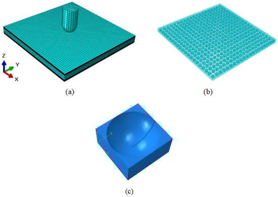 Finite element model of composite laminate under impact loading. (a) The whole model. (b) The rubber model: there are 400 same-sized spherical voids uniformly distributed in the model. (c) Half of void-containing cube.