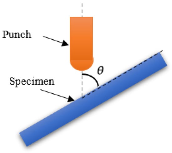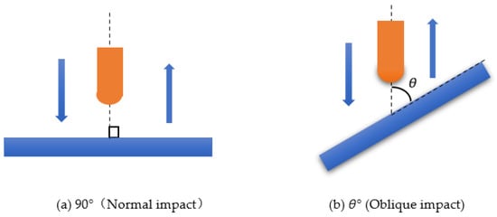 The impact angle of the falling hammer is varied in the numerical simulation, as shown in Figure 3. The impact angle θ is defined as the angle between the impact axis and the specimen. The two components of the vertical impact velocity are normal velocity Vn and tangential velocity Vt. In this paper, the impact velocities are set as 4.970 m/s, 5.495 m/s, 5.973 m/s, 6.419 m/s, 6.830 m/s, and 8 m/s, and the impact angles are 30°, 45°, 60°, 75°, and 90°, respectively.