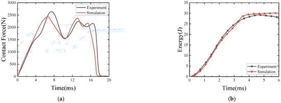 Comparison of experimental results and simulation results for sandwich structures with porosity f0 = 0.17 at 30 J impact energy, (a) Contact Force-deflection; (b) Energy-time.