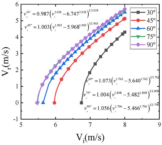 The relationship between the initial and residual velocities of the impact at different angles was obtained from the data in Table 2, and the curve was fitted using the Levenberg–Marquardt optimization algorithm based on the data and the following equation (R2 > 0.99) as shown in Figure 5, with the expression valid only for vi > vthreshold.