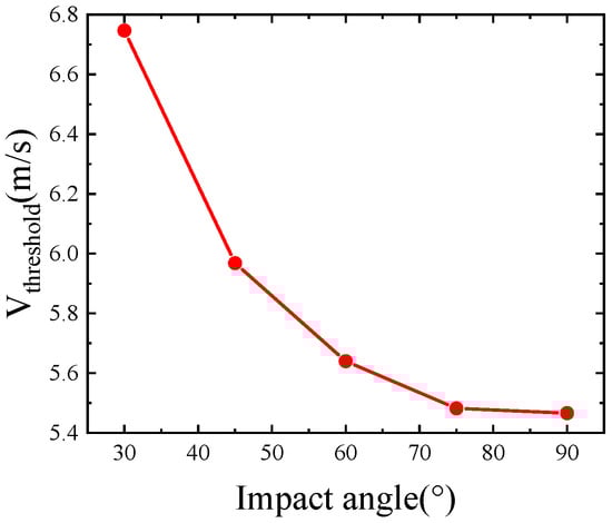 As shown in Figure 6, the penetration thresholds at 30°, 45°, 60°, 75°, and 90° can be obtained from the regression curves in Figure 5 as 6.747 m/s, 5.968 m/s, 5.640 m/s, 5.482 m/s, and 5.466 m/s, respectively. From this, it can be seen that the impact resistance decreases with the increase of impact angle by 11.5%, 16.4%, 18.7%, and 18.9% when the impact angle is greater than 45° and, with the increase of impact angle, the difference of impact threshold becomes smaller and smaller. When the impact angle is greater than 75°, compared with 90°, the difference of impact resistance performance is only 2.9%; at this time the impact angle has less impact resistance performance.