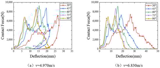 The contact force displacement curves of the sandwich structure under different impact angles with impact velocities of 4.970 m/s and 6.830 m/s are shown in Figure 8. It can be seen from the curves that when the impact velocity is 4.970 m/s, the load goes through two rises and two falls, and the sudden fall of the load is due to the compression damage of the substrate in the impact area. In the rebound phase, the curve is relatively stable, and finally, the hammer head is out of contact with the sandwich structure, and the load disappears. When the impact speed is 6.830 m/s, the sandwich structure is completely penetrated at various impact angles, and no rebound occurs. It can be seen from the figure that in the case of oblique impact, whether the falling hammer partially bounces or the falling hammer completely penetrates the core structure, the peak contact force is positively correlated with the impact angle, and the displacement under the maximum load is negatively correlated with the impact angle. In the positive impact case, the friction force is very small and almost negligible, and its maximum contact force is slightly less than 75°.