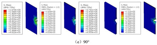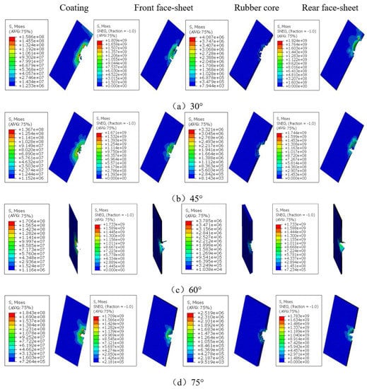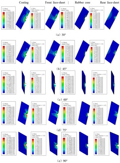 Figure 9 shows the final damage and stress clouds of each profile of the sandwich structure under different angles of impact at v = 4.970 m/s. According to Figure 9, it can be seen that the structure will always produce craters after the impact of the falling hammer regardless of the change of the impact angle, but the center of the craters will change, which is more obvious when the impact angle is small. As the impact angle decreases from 90° (positive impact), the slip becomes more and more, and the center of the crater moves in the direction of the slip, accordingly. The nature of the crater is the plastic deformation of the sandwich structure to absorb the energy after the impact load is applied. Comprehensive Table 2 and Figure 9 show that at v = 4.970 m/s, the impact head bounced to different degrees at various impact angles, and the sandwich structure was not completely penetrated, but the bottom panel had different degrees of damage, of which 90° damage was the most serious. When the impact hammer head penetrated the coating, the upper panel, and the core, the coating of the sandwich structure was broken, the upper surface had fiber fracture, and the core was broken, which were caused by the shearing process, and these damages appeared independent of the impact velocity. As the impact velocity was below the penetration threshold, the bottom panel showed matrix cracks. In addition, it is obvious that when excluding the energy consumed by slip friction, most of the impact energy loaded onto the structure is mainly consumed through plastic deformation of the upper panel and flexural deformation of the core unit, and the deformation of the lower panel under low-energy impact is extremely small and almost does not participate in energy absorption. When the impact is oblique, craters appear in the coating, the upper panel, and the core, and cracks extend from the edges of the craters.