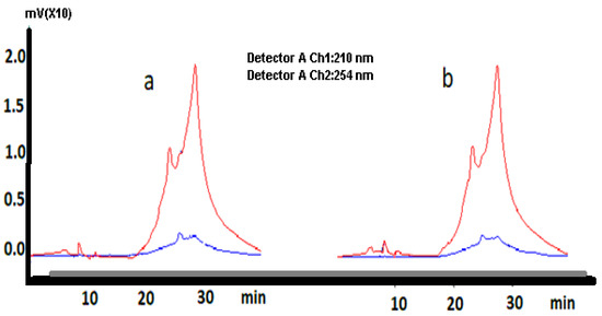 The HPLC analysis spectrum of goji berry extracts ta40 (a) and ta60 (b).