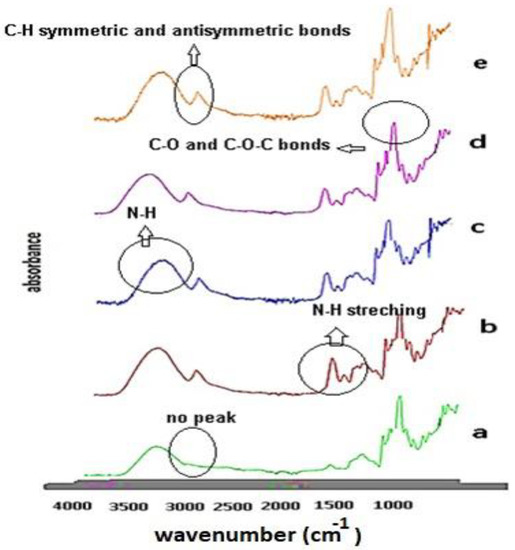 In the spectrum of the wheat gluten (Figure 2b), the peaks at the wavelengths of 1178–1021 cm−1 showed C-O stretching vibrations in the C-O-C groups. The broad band that appeared at 3272 cm−1 represented hydroxyl groups bonded with hydrogen and N-H stretching bands. The FTIR-ATR spectra of the silver nanofilms are shown in Figure 2c–e. The peaks at 1641–1643–1640 cm−1 in Figure 2 originated from interactions of the taurine and garlic extracts that were used to modify the clay. The peak at 1641 cm−1 also represented the C-O stretching that overlapped with the N-H stretching in the same region (amide II).