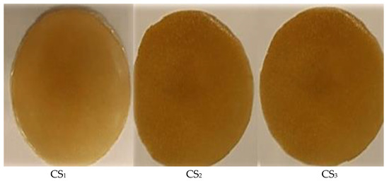 The presence of organoclay in the structure of the CS2 and CS3 silver nanofilms is a factor that reduces elasticity. The improvement of the mechanical properties of the synthesized silver nanofilms is also confirmed by scanning electron microscope images. The roughness of the surfaces is proof that their mechanical properties have improved. Figure 7 shows images of obtained silver nanofilms. The different concentrations of silver nitrate and sodium borohydride (0.3, 0.5, and 0.8 mM) caused darker color tones of the silver nanofilms.