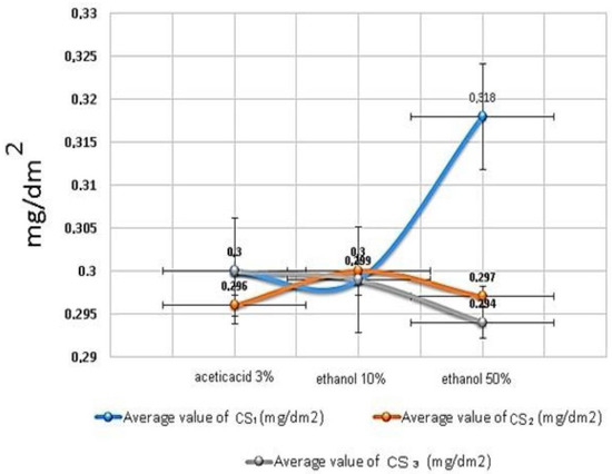 Table 3 and Figure 6 show the results of the migration and statistical analysis. According to the results, silver nanofilms can be used as food packaging material according to Article 8 of TGK 2013/34, and the analysis values are well below the reference values. Although the migration concentration of the materials is 6 dm2 of packaging material per 1 kg in accordance with the European Regulation 10/2011 (EC, 2011), according to TGK 2013/34 Article 8 in Turkey, the migration limit concentration of materials for foods is 10 mg/dm2 [18,28,29,30]. Figure 6 shows the migration analysis results of the CS silver nanofilms. As a result, it was proven by the analysis results that the CS1, CS2, and CS3 nanocomposite films were suitable to be packaging films for packaging production in milk and milk products, liquid foods, and acidic foods. It can be seen that all of the migration analysis results are quite below the standards values. If they are evaluated only according to the migration analysis results, it is possible to say that the synthesized silver nanofilms can be used in all food packaging, but the antibacterial analysis results limit this area, so it is recommend that they be used primarily in the food packaging of milk and dairy products.