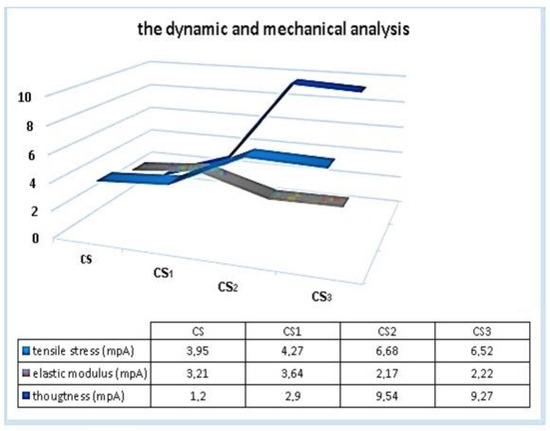 Figure 7 shows the tensile stress, elastic modulus, and toughness of pure CS, CS1, CS2, and CS3 silver nanofilms. According to the analysis results obtained, the tensile stress and toughness values of the CS2 and CS3 silver nanofilms showed more improvement than the CS1 silver nanofilm. The tensile stresses of CS2 and CS3 were increased by 68%, and the tensile stress of CS1 was increased by 8%, respectively. The reason for this can be said to originate from organoclay contained in the CS2 and CS3 silver nanofilms. As is known, organoclays are filling materials that support mechanical durability. In addition, even if the absence of organoclay in CS1 has lower tensile stress than CS2 and CS3, it can be said that it develops compared to the mechanical properties of pure CS biopolymer [17]. Moreover, the elastic modulus of CS1 showed more improvement than CS2, CS3, and pure CS. The increase in elastic modulus tends to decrease by 68% for the CS2 and CS3 silver nanofilms.