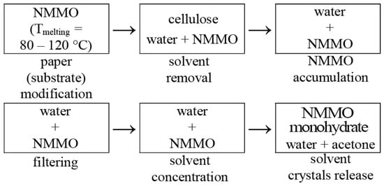 Next, we proceed to the stage of the accumulation of the used aqueous NMMO solutions without dwelling on the previously described stages of substrate modification and NMMO removal. When the required NMMO content is reached, the system enters filtration, where low molecular weight components and heteropolymers released during dissolution of the paper substrate surface are removed using membranes and others. Next, the purified aqueous NMMO solution is fed to remove excess water and obtain a concentrated water–solvent system. In the last stage, if necessary, the NMMO monohydrate is deposited with acetone or other non-solvents at a temperature of at least 50 °C. Acetone saturated with water should be regenerated. Technological features and issues related to the regeneration of the solvent used are described in [,,]. The regenerated solvent is used again in the initial stages of paper processing.