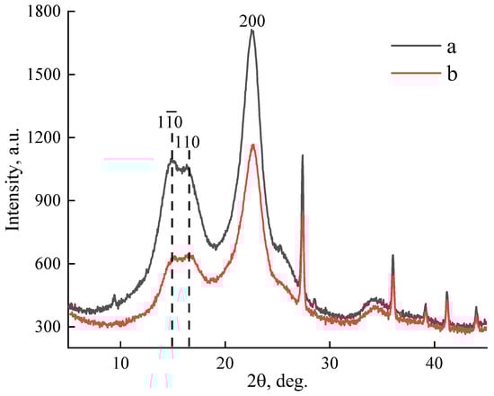 The native cellulose (polymorph I) from which the paper was obtained was characterized by peaks in the 2𝜃~14.8°, ~16.6°, and ~22.6° regions, which corresponded to planes with Miller indices 1–10, 110, and 200 []. The interaction of cellulose with the solvent, for example, in the process of obtaining spinning solutions and the isolation of the polymer phase during coagulation, formed a different structural organization accompanied by a cardinal change in the diffraction pattern, shifting the main peaks in the region of 2 𝜃~12.3°, ~20.5°, and ~21.9° (polymorph II). In the case of short-term treatment of the paper surfaces with solvent, the course of the curves in the diffractograms changed insignificantly (Figure 3). However, the intensity of the peaks changed after paper treatment. For peaks 1–10 and 200 it decreased, while for 110, in contrast, it increased. The ratio of intensities for peaks 1–10 and 200 increased from 1.57 for the original paper to 1.83 for the modified paper. The crystallinity of the original paper was 57.6%, while after NMMO treatment, it decreased to 47.8%. Thus, after a brief interaction of the paper with the solvent, a decrease in the structural ordering of the cellulose was observed.