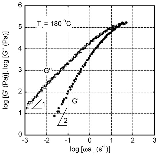 Master curves of shear storage modulus G′ and loss modulus G″ as a function of angular frequency ω at the reference temperature Tr of 180 °C.
