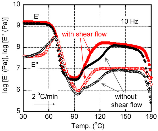 Figure 5 shows the temperature dependences of dynamic tensile moduli, such as storage modulus E′ and loss modulus E″, for the quenched films with/without shear history. As seen in the figure, E′ showed a significant drop in the temperature range from 60 °C to 80 °C, at which E″ showed a sharp peak ascribed to the glass-to-rubber transition at around 67 °C. The value corresponded with those reported in previous papers [9,11,18,21]. Moreover, the E′ values increased with the temperature from 90 °C to 120 °C, which was attributed to the cold crystallization. The modulus increase occurred earlier for the film with applied shear history, which corresponded with the DSC result in Figure 4. Although the effect of shear history was not so obvious in the dynamic mechanical properties, it would be owing to the slow heating rate at the measurements, i.e., 2 °C/min for the dynamic mechanical analysis (30 °C/min for the DSC measurements). After the cold crystallization, E′ became higher than 100 MPa. The values are comparable to those of pure isotactic polypropylene in the same temperature range. In other words, PLA shows a similar rigidity to isotactic polypropylene, when crystallized sufficiently. Beyond 165 °C, both moduli decreased due to melting, at which it occurred at a slightly higher temperature for the film with shear flow. The melting point was also similar to that of isotactic polypropylene.