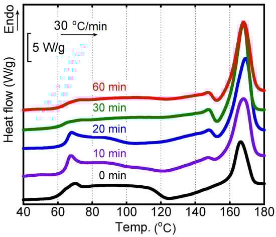 DSC heating curves of the sheared films after annealing at 80 °C for various periods. The heating rate was 30 °C/min.
