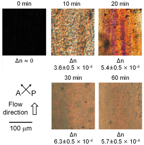 Figure 7 shows the optical microscope images under crossed polarizers. The directions of the polarizer (P) and analyzer (A) and applied flow in the rheometer were described in the figure. The films having the shear history were exposed to annealing at 80 °C for various periods. The annealing periods were indicated at the top of the pictures.