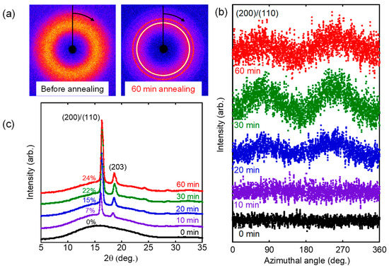 (a) 2D-WAXD patterns, (b) azimuthal distribution of (200)/(110) plane, and (c) 2θ profiles of the sheared films after annealing at 80 °C for various periods.