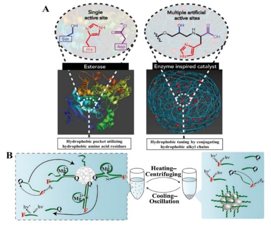 - Wang, Z.; Yang, J.; Xiao, W.; Chen, T.; Yi, C.; Xu, Z. Engineering of polystyrene-supported artificial catalytic triad constructed by nanoprecipitation for efficient ester hydrolysis in water. Colloids Surf. A Physicochem. Eng. Asp. 2022, 644, 128902. [Google Scholar] [CrossRef]