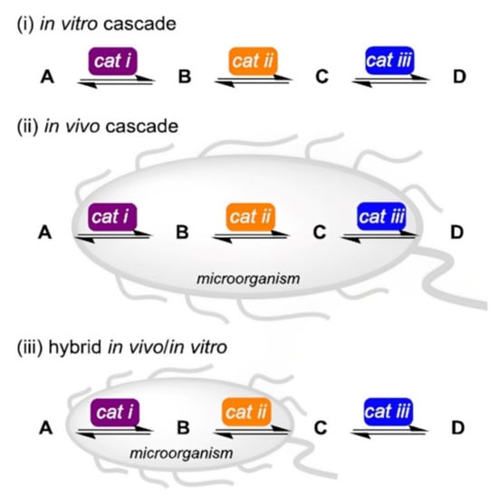- Muschiol, J.; Peters, C.; Oberleitner, N.; Mihovilovic, M.D.; Bornscheuer, U.T.; Rudroff, F. Cascade catalysis–strategies and challenges en route to preparative synthetic biology. Chem. Commun. 2015, 51, 5798–5811. [Google Scholar] [CrossRef] [PubMed]