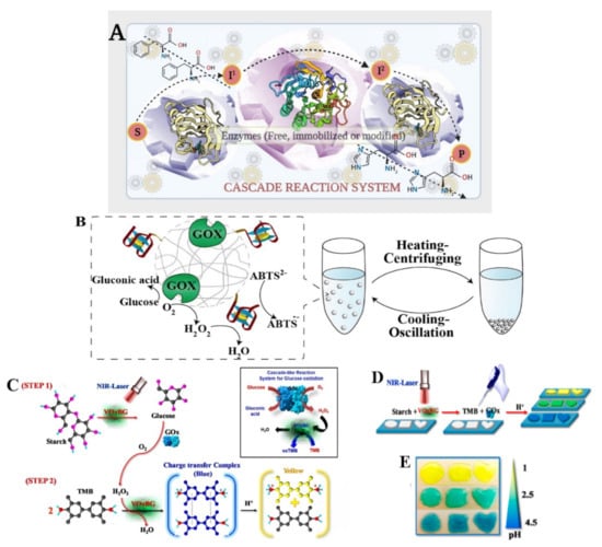 - Zhou, W.; Zhou, X.; Rao, Y.; Lin, R.; Ge, L.; Yang, P.; Zhang, H.; Zhu, C.; Ying, H.; Zhuang, W. Stabilizing bienzymatic cascade catalysis via immobilization in ZIF-8/GO composites obtained by GO assisted co-growth. Colloids Surf. B Biointerfaces 2022, 217, 112585. [Google Scholar] [CrossRef]