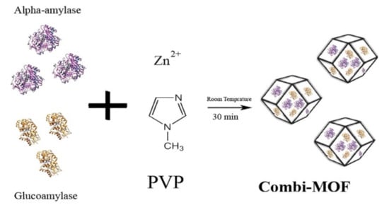 - Salgaonkar, M.; Nadar, S.S.; Rathod, V.K. Combi-metal organic framework (Combi-MOF) of α-amylase and glucoamylase for one pot starch hydrolysis. Int. J. Biol. Macromol. 2018, 113, 464–475. [Google Scholar] [CrossRef]