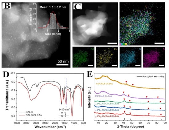 - Li, X.; Hu, X.; Qiao, Y.; Lu, T.; Bai, Y.; Xiong, J.; Li, X.; Gou, Q.; Ge, J. Enzyme-bimetallic hybrid catalyst for one-pot chemoenzymatic reactions. Chem. Eng. J. 2023, 452, 139356. [Google Scholar] [CrossRef]