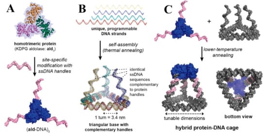 - Xu, Y.; Jiang, S.; Simmons, C.R.; Narayanan, R.P.; Zhang, F.; Aziz, A.-M.; Yan, H.; Stephanopoulos, N. Tunable nanoscale cages from self-assembling DNA and protein building blocks. ACS Nano 2019, 13, 3545–3554. [Google Scholar] [CrossRef] [PubMed]