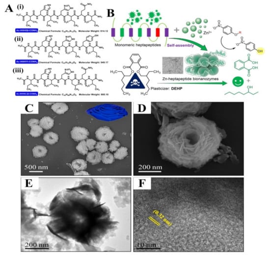 - Liang, S.; Wu, X.-L.; Zong, M.-H.; Lou, W.-Y. Construction of Zn-heptapeptide bionanozymes with intrinsic hydrolase-like activity for degradation of di (2-ethylhexyl) phthalate. J. Coll. Interface Sci. 2022, 622, 860–870. [Google Scholar] [CrossRef] [PubMed]