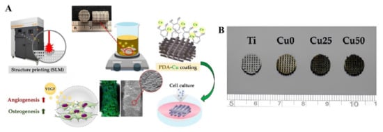 - Wu, H.-Y.; Lin, Y.-H.; Lee, A.K.-X.; Kuo, T.-Y.; Tsai, C.-H.; Shie, M.-Y. Combined Effects of Polydopamine-Assisted Copper Immobilization on 3D-Printed Porous Ti6Al4V Scaffold for Angiogenic and Osteogenic Bone Regeneration. Cells 2022, 11, 2824. [Google Scholar] [CrossRef] [PubMed]