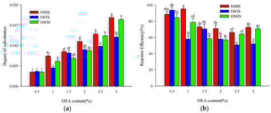 As shown in the Figure 2a, the DS values of OSRS (0.0034–0.0169), OSTS (0.0038–0.0121) and OSOS (0.0034–0.0164) all significantly increased with the increased level (0.5–3.0%) of OSA modification, and Figure 2b shows the RE values of the corresponding OS-starch. The increased OSA concentration also improved the probability of contact between starch molecules and OSA, which promoted the progress of esterification substitution reaction and more hydroxyl groups on starch molecules were replaced, thus the DS values were increased. At present, the quality standard of food additives stipulates that the degree of OS-starch modification is less than 3% (the amount of modifier used is less than 3% of the quality of starch dry base), and the DS when used as a food additive does not exceed 0.02 [10,20]. The modification levels and DS values of OS-starch obtained in this study were all controlled within the required limits of food additives; it can be directly applied as a particle emulsifier in the food system. The difference between the DS and RE values of different plant-derived OS-starch were related to starch particle size as well as particle structure, and it will be discussed in the following results.