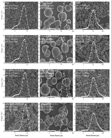 Figure 3 shows the scanning electron micrographs and PSD of NS (NRS, NTS, NOS) and OS-starch (OSRS, OSTS, OSOS). NRS were irregular polygon particles with a relatively uniform size, d(0.5) value of 4.51 μm and a unimodal distribution (particle size range of 0.50–14.15 μm). NTS were mainly spherical large particles and a small number of unspherical small particles, with a d(0.5) value of 15.07 μm and a bimodal distribution (large particle size range 6.32–35.56 μm, small particle size range 0.44–3.16 μm). The particle size range of NOS was relatively wide (0.63–112.46 μm), and mainly oval small particles or a small number of irregular shapes of large particles, with a d(0.5) value of 10.46 μm and showing a single peak distribution. These were in line with the results reported in the literature [9,14].
