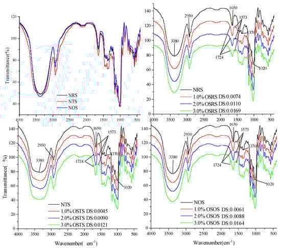 The structural unit of the starch molecules is α -D-pyran glucose, and the main characteristic absorption peak of the infrared spectrum comes from the hydroxyl groups on C2, C3, and C6, as well as the circular structure of the glucose molecules. It is observed from Figure 4 that the NRS, NTS and NOS have the same characteristic absorption peaks at 3380 cm−1, 2930 cm−1, 1650 cm−1, 1370 cm−1 and 1020 cm−1. Among them, the larger peaks occurring at 3380 cm−1 were generated by O-H expansion vibration; the peaks occurring at 2930 cm−1 were generated by C-H expansion vibration; the peaks occurring at 1650 cm−1, 1370 cm−1 and 1020 cm−1 were generated by C-O [23]. New characteristic absorption peaks of the infrared spectra of OSRS, OSTS and OSOS appear at 1724 cm−1 and 1573 cm−1 after being modified by OSA, which correspond to the C = O expansion vibration of the ester group and the asymmetric expansion vibration of the RCOO-group [24], respectively, and the intensity of the new characteristic peaks enhanced with the increasing of DS value. These indicated that the OS groups replaced part of the hydroxyl groups on the NS molecule and connected to the hydroxyl group on the glucose unit as ester bonds, which was a marker of the successful esterification of OSA with NRS, NTS and NOS. Song [14] and Wang [11] obtained similar results by performing a hydrophobic modification with wheat starch, rice starch, and corn starch using OSA, respectively.