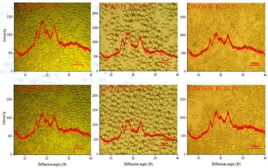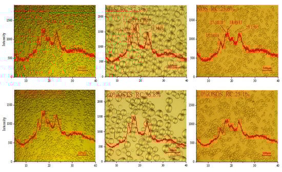 The crystalline structures and amorphous structures of starch differ in their density and refractive index in the starch granules. A polarized cross of the crystalline structure can be clearly observed through the irradiation of polarized light. When the crystalline structures changes, the polarized cross also changes. The polarized crosses of NS (NRS, NTS, NOS) and OS-starch (OSRS, OSTS, OSOS) granules were clearly observed from the PLM of Figure 5; this indicated that both NS and OS-starch had a crystalline structure, and the RC values of NRS, NTS and NOS were 26.8%, 37.3% and 25.6%, respectively. In addition, the XRD diffraction curves of starch will present a specific type of curve, providing sufficient evidence for the orderly crystalline structure of starch granules, that is, the crystalline structure has a sharp peak diffraction characteristic, while the amorphous structure has a diffuse peak diffraction characteristic. The crystalline structure of starch can be classified according to the outline of the XRD diffraction curve, which can be generally divided into four types: A, B, C and V [25,26]. As can be seen in Figure 5, the XRD curves of NRS, NTS and NOS showed strong diffraction peaks near the 2θ = 15°, 17°, 18° and 23° and the continuous peaks at 17°and 18°, which all belong to the characteristic peaks of type A starch [27,28], and the XRD curves of OSRS, OSTS and OSOS also showed characteristic peaks at the corresponding 2θ angular positions, indicating that crystal structure types of the OSRS, OSTS and OSOS still belonged to type A. He et al. [29] suggested that the esterification of rice starch and OSA did not change the crystalline patterns of rice starch. According to Jiang et al. [21], the esterification reaction of taro starch with OSA mainly occurred in the amorphous region of the starch because the OSA modification treatment did not change the crystal structure type of taro starch. However, with the increasing levels of OSA modification and DS values, the RC values of OSRS, OSTS, and OSOS showed a decrease trend, and the intensity and sharpness of diffraction peak were also weakened. Peng et al. [30] and Yu et al. [16] obtained similar results by performing a hydrophobic modification with waxy corn starch and taro starch using OSA, respectively. During the esterification, the OS groups can penetrate into the crystalline region of the starch granules and react with the starch molecules therein and replace the hydroxyl group on the glucose molecule, causing changes in the ordered structure within the starch molecule, thus affecting the RC of the starch granules to a certain extent [31]. These indicated that although the esterification reaction had some effect on the crystalline region of starch, it did not change the crystal structure type of starch, therefore, the esterification reaction mainly occurred in amorphous regions of starch.